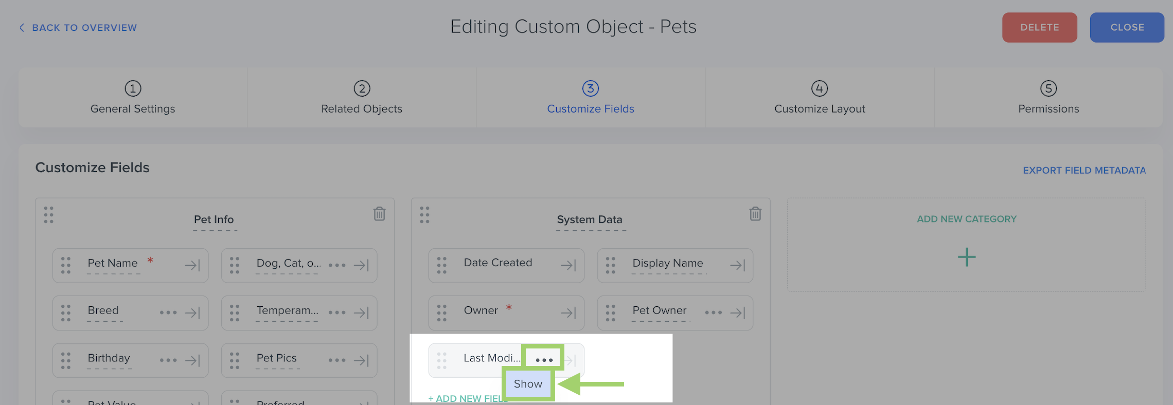 - To unhide a Custom Field, click on the "..." menu to the right of the field name > "Show":