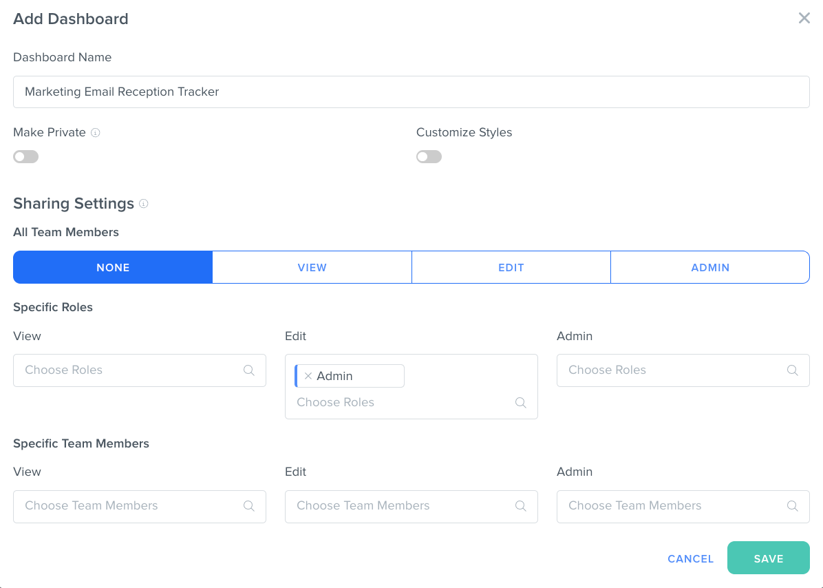 - Choose your Sharing Settings to select the default permissions for this Dashboard for all team members in your account. (For example, "None" prevents access to this Dashboard unless you specify which specific roles or which specific team members can view, edit, or have admin access to your Dashboard.)