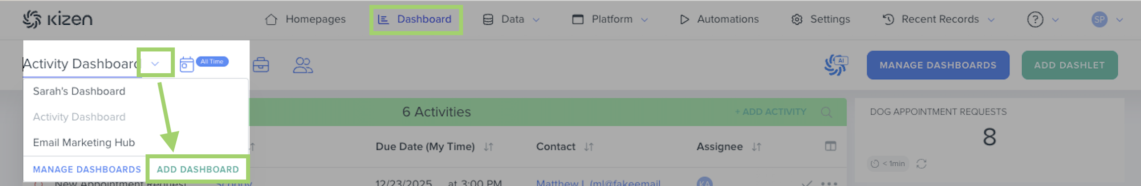 - Click on "Dashboard" in your toolbar menu at the top of your screen > Click on the down caret next to the Dashboard name > Click on the green "Add Dashboard" button.