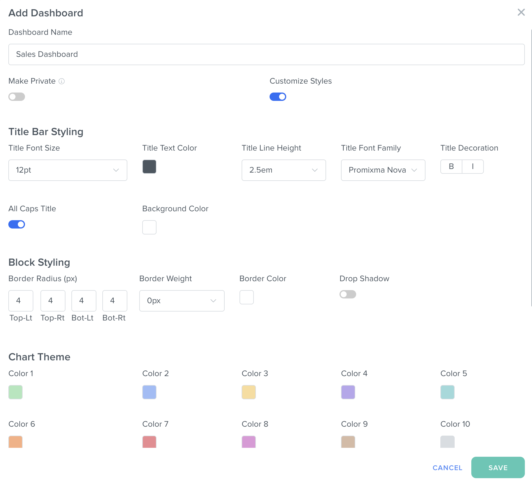 - Toggle "Customize Styles" on if you would like to customize the text font, block formatting, and colors in your Dashboard.