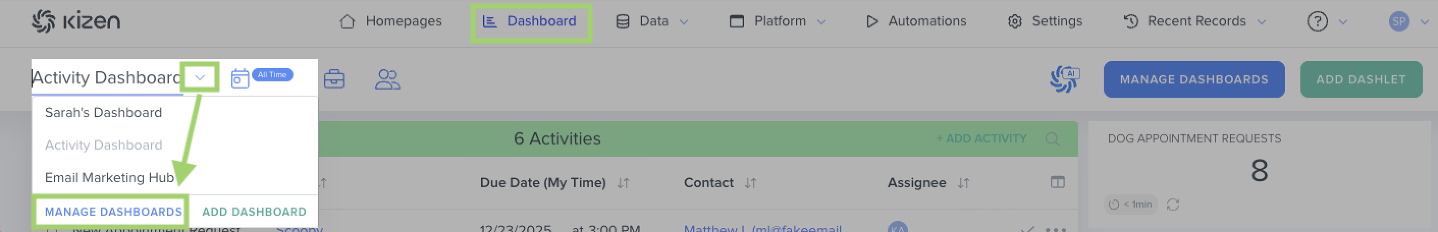 - Click on "Dashboard" in your toolbar menu at the top of your screen > Click on the down caret next to the Dashboard name and select the Dashboard you want to edit or delete.