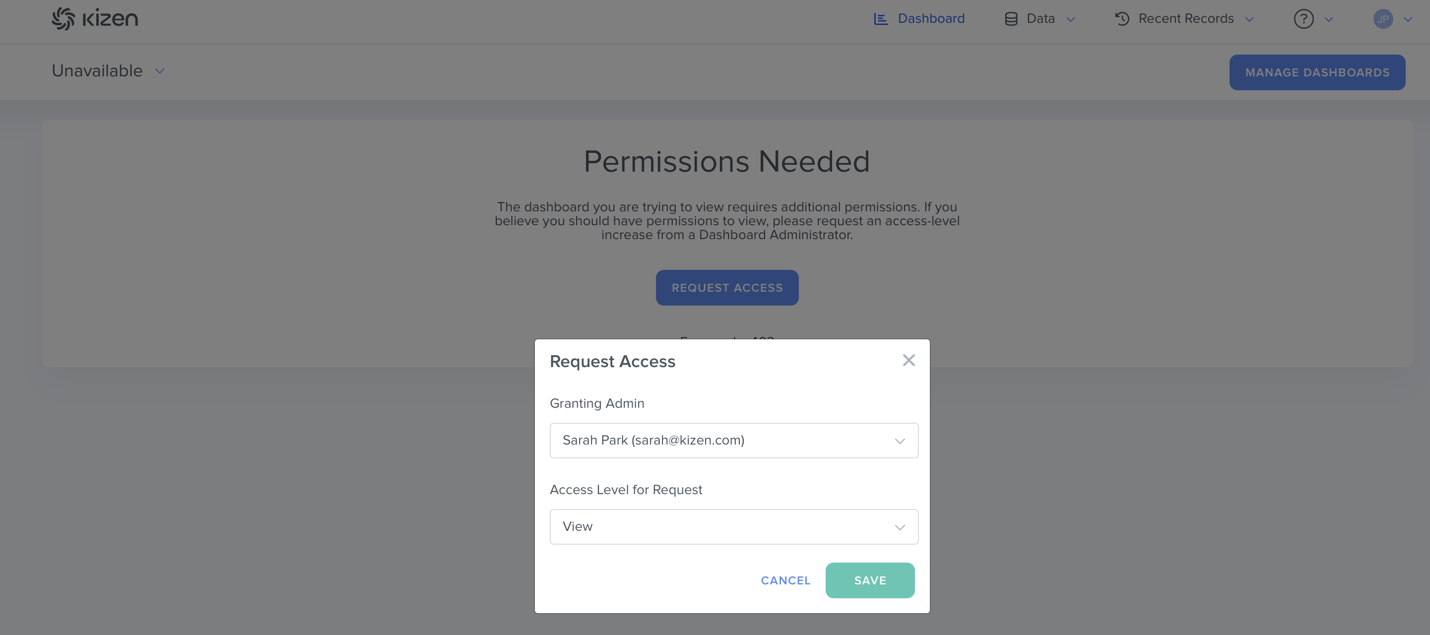 Whenever a team member in your Kizen account requests access to one of your Dashboards, you will receive an email notification.