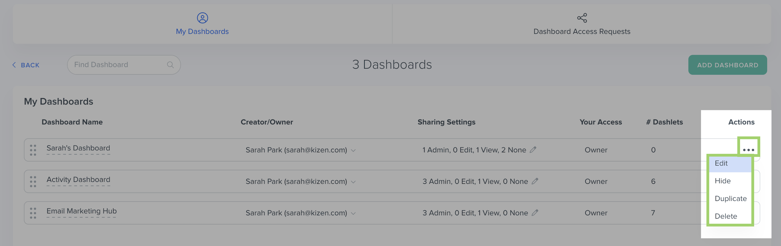 - Duplicate: Need to make changes, but don't want to break anything? Create a copy of this Dashboard to test your edits safely and allow room for error. You can also choose to duplicate existing Dashboards as "templates" to create new Dashboards with the same Dashlets, but for different purposes.