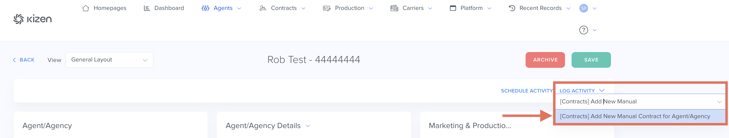 - In the top right of the agent’s record, select Log Activity > "Add New Manual Contract for Agent/Agency" from the dropdown menu.