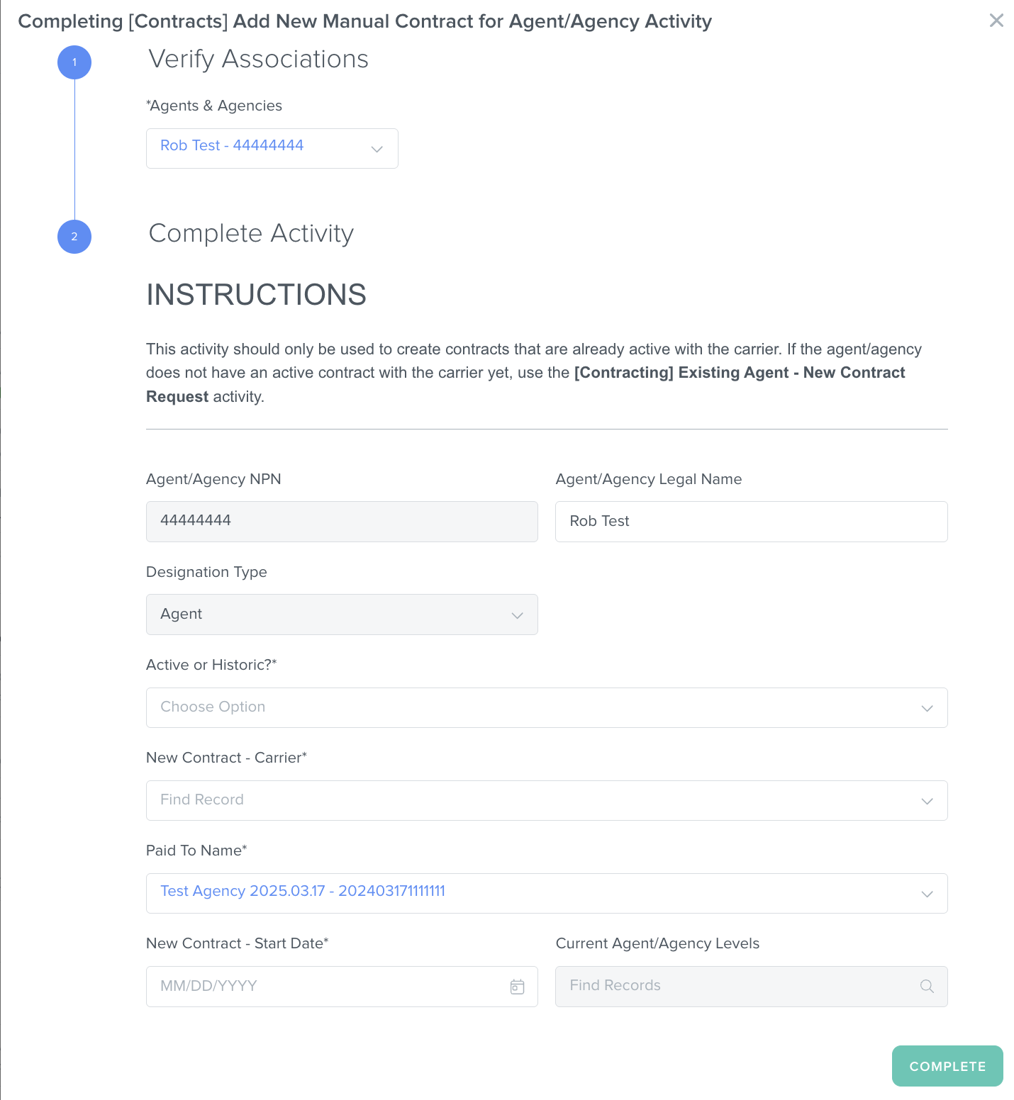 ⚠️ Note: Active contracts can only be manually created for self-service/non-RTS-pipeline carriers. If the "[Contracts] Add New Manual Contract for Agent/Agency" Activity is logged for a full service/RTS-pipeline carrier, this will result in a validation error. If the agent/agency does not have an active contract with the carrier yet, use the "[Contracting] Existing Agent - New Contract Request" activity.
