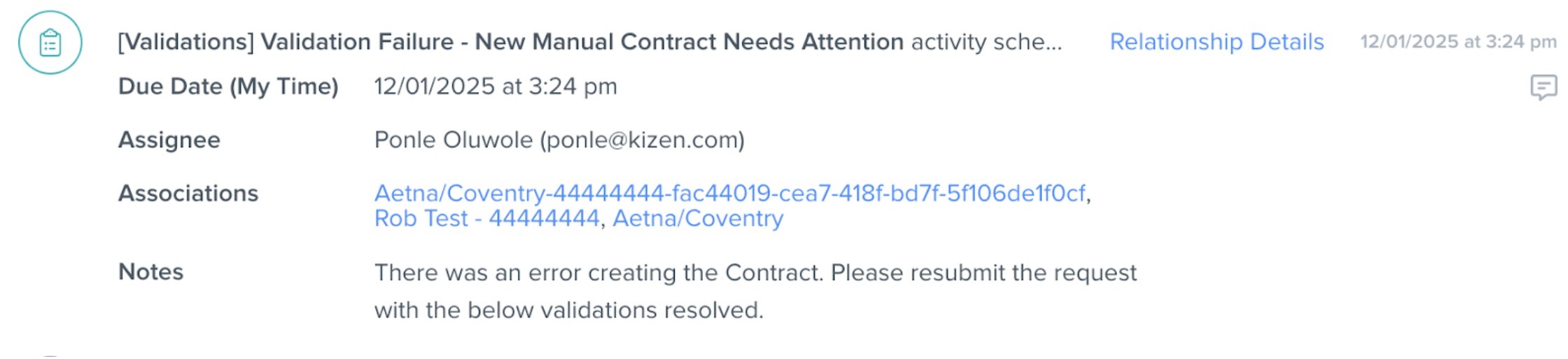 ⚠️ Note: The contract will only be created if validations are passed successfully. If more information is required or there is an issue with the submission, you will see the "Validation Failure - New Manual Contract Needs Attention" scheduled activity in the agent record's Timeline: